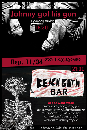 21:00: Την ταινία θα ακολουθήσει μπαρ με Beach Goth μουσική για οικονομική ενίσχυση της μετακίνησης του κόσμου από τη Θεσσαλονίκη στην Αλεξανδρούπολη για την Αντιπολεμική-Αντινατοϊκή-Αντιιμπεριαλιστική-Αντικαπιταλιστική πορεία του Σαββάτου (13/06). Για κλείσιμο θέσεων στο λεωφορείο μπορείτε να επικοινωνήσετε με τηλέφωνο ή email αντίστοιχα στα: 6984859355 / libre12o@gmail.com.