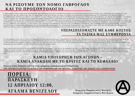 Όλοι/ες στους δρόμους ενάντια στην τρέχουσα εκπαιδευτική αναδιάρθρωση που εξυπηρετεί μονάχα τις ανάγκες του κεφαλαίου και του κράτους. Στηρίζουμε την απεργία των εκπαιδευτικών.