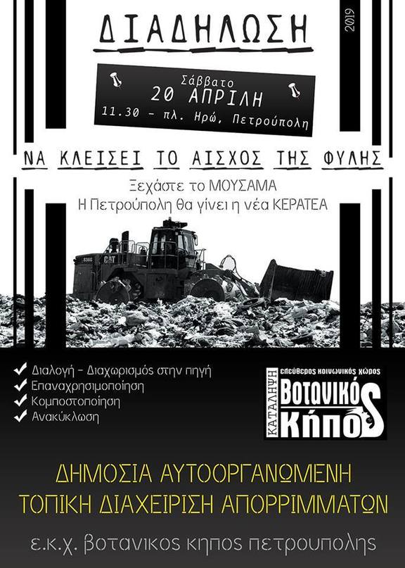 Παραθέτουμε το κοινό κάλεσμα των ΣΥΝΔΙΟΡΓΑΝΩΤΩΝ: Χωματερή stop-πολίτες εν δράσει - Σύλλογος Εκπαιδευτικών Π.Ε. «Δ.Γληνός» - Αγωνιστική Παρέμβαση Εργαζομένων Δ.Πετρούπολης - Ελεύθερος Κοινωνικός Χώρος «Βοτανικός Κήπος»