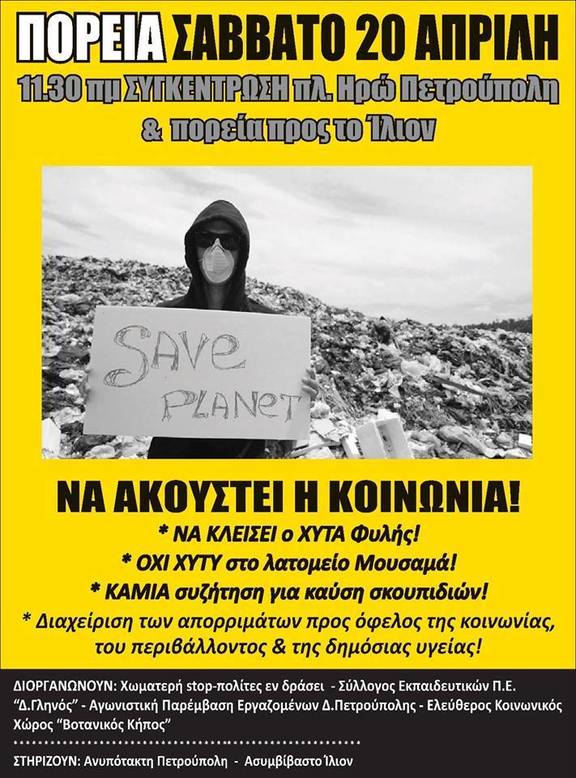 Πορεία Σάββατο 20/4/19, 11.30 π.μ.: Να κλείσει η Φυλή! Όχι ΧΥΤΥ στο Μουσαμά!