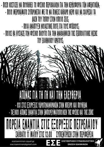Το τελευταίο διάστημα γινόμαστε μάρτυρες μια συνεχόμενης προσπάθειας να πειστούμε πως οι εξορύξεις αποτελούν "σωτήρια λύση" για την Ήπειρο αλλά και συνολικότερα τον ελλαδικό χώρο. Οι πρώτες ερευνητικές γεωτρήσεις στην Ήπειρο είναι ο προάγγελος των όσων θα ακολουθήσουν. Tο 2019 προβλέπεται να είναι καθοριστικό για την ολοκλήρωση των διαδικασιών, ώστε να ξεκινήσουν εργασίες και στην Αιτωλοακαρνανία, στη ΒΔ Πελοπόννησο, στο Κατάκολο, στον Πατραϊκό, σε όλο το Ιόνιο και στις θαλάσσιες περιοχές νότια και νοτιοδυτικά της Κρήτης. Αυτές οι ''επενδύσεις'' φυσικά το μόνο που μπορούν να προσφέρουν είναι πλούτο στις πολυεθνικές και στους εγχώριους συνεργάτες τους αλλά και τεράστιες ανεπανόρθωτες οικολογικές καταστροφές. Όσο ο κρατικός σχεδιασμός παραχωρεί μεγάλες εκτάσεις προς ενεργειακή εκμετάλλευση , ο ήδη ταλαιπωρημένος υδροφόρος ορίζοντας μολύνεται και καταστρέφεται. Φυσικά η ύπαρξη και εξόρυξη υδρογονανθράκων μόνο όξυνση των ενδοκαπιταλιστικών και διακρατικών ανταγωνισμών μπορεί να επιφέρει σε μία ήδη έκρυθμη κατάσταση στη νοτιανατολική Μεσόγειο και τη Μέση Ανατολή. Πέρα απ' όλα τα άλλα, το ζήτημα της διαχείρισης των φυσικών πόρων είναι ένα ζήτημα κοινωνικού ελέγχου. Την άμεση δηλαδή διαχείριση της ενέργειας για την εξυπηρέτηση και τις ανάγκες της κοινωνίας. Κανείς δεν είναι πιο κατάλληλος από εμάς τους ίδιους για να υπερασπιστεί το περιβάλλον στο οποίο ζούμε, και να βάλει φρένο σε όσους υποτιμούν τις ζωές μας. Οι αυτοοργανωμένοι και αδιαμεσολάβητοι αγώνες είναι ο μόνος τρόπος για να αντεπιτεθούμε!