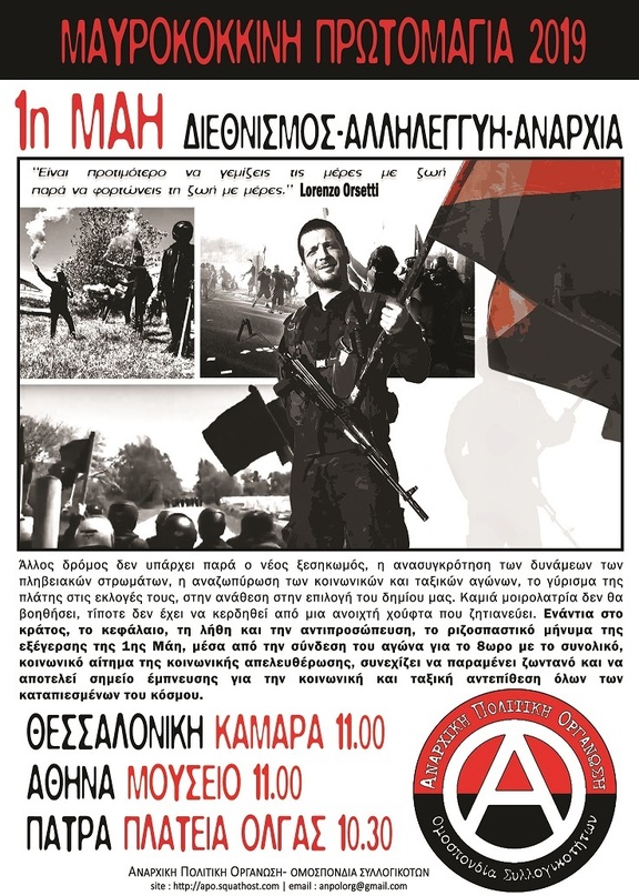 Όπως και οι σύντροφοί μας στο Σικάγο 133 χρόνια πριν, δεν ξεχνάμε πως σκοπός του αγώνα μας ως αναρχικοί/ές δεν είναι το να αποκτήσουμε όλοι ίσα δικαιώματα στη σκλαβιά ούτε να κάνουμε τις αλυσίδες μας λίγο πιο ελαφριές αλλά το να αποκαταστήσουμε πλήρως την ανθρώπινη υπόστασή μας, κάτι που μπορεί να συμβεί μόνο σε συνθήκες ισότητας, αλληλεγγύης και ελευθερίας.