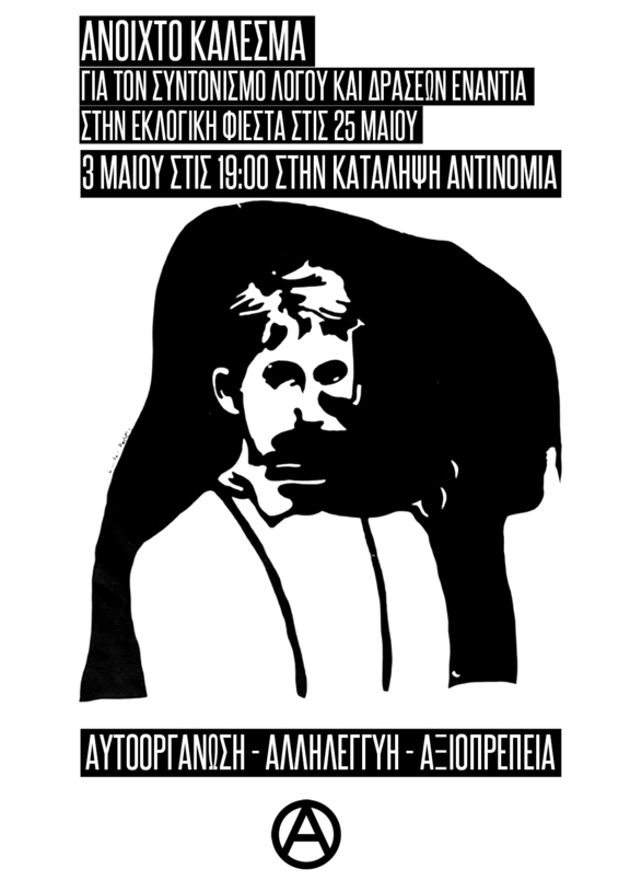 την παρασκευη 3 μαη στις 19.00 θα γινει η πρωτη ανοιχτη συνελευση για τον συντονισμο αντιεκλογικων δρασεων και την παραγωγη αντιεκλογικου λογου. η συνελευση καλειται απο αναρχικους και αναρχικες στην καταληψη αντινομια στον χωρο του παλιου ψυχιατρειου.