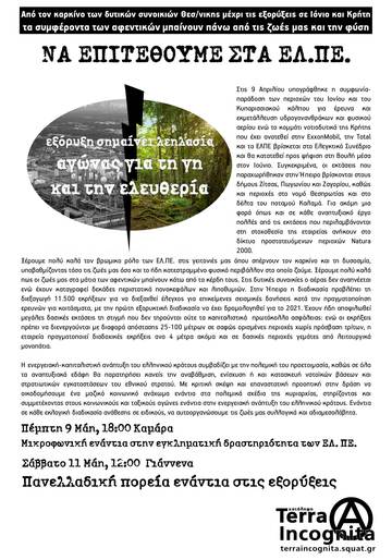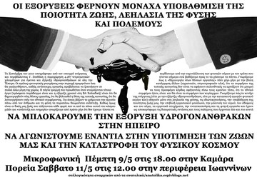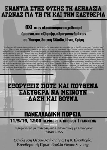 Το τελευταίο διάστημα γινόμαστε μάρτυρες μια συνεχόμενης προσπάθειας να πειστούμε πως οι εξορύξεις αποτελούν "σωτήρια λύση" για την Ήπειρο αλλά και συνολικότερα τον ελλαδικό χώρο. Οι πρώτες ερευνητικές γεωτρήσεις στην Ήπειρο είναι ο προάγγελος των όσων θα ακολουθήσουν. Tο 2019 προβλέπεται να είναι καθοριστικό για την ολοκλήρωση των διαδικασιών, ώστε να ξεκινήσουν εργασίες και στην Αιτωλοακαρνανία, στη ΒΔ Πελοπόννησο, στο Κατάκολο, στον Πατραϊκό, σε όλο το Ιόνιο και στις θαλάσσιες περιοχές νότια και νοτιοδυτικά της Κρήτης. Αυτές οι ''επενδύσεις'' φυσικά το μόνο που μπορούν να προσφέρουν είναι πλούτο στις πολυεθνικές και στους εγχώριους συνεργάτες τους αλλά και τεράστιες ανεπανόρθωτες οικολογικές καταστροφές. Όσο ο κρατικός σχεδιασμός παραχωρεί μεγάλες εκτάσεις προς ενεργειακή εκμετάλλευση , ο ήδη ταλαιπωρημένος υδροφόρος ορίζοντας μολύνεται και καταστρέφεται. Φυσικά η ύπαρξη και εξόρυξη υδρογονανθράκων μόνο όξυνση των ενδοκαπιταλιστικών και διακρατικών ανταγωνισμών μπορεί να επιφέρει σε μία ήδη έκρυθμη κατάσταση στη νοτιανατολική Μεσόγειο και τη Μέση Ανατολή. Πέρα απ' όλα τα άλλα, το ζήτημα της διαχείρισης των φυσικών πόρων είναι ένα ζήτημα κοινωνικού ελέγχου. Την άμεση δηλαδή διαχείριση της ενέργειας για την εξυπηρέτηση και τις ανάγκες της κοινωνίας. Κανείς δεν είναι πιο κατάλληλος από εμάς τους ίδιους για να υπερασπιστεί το περιβάλλον στο οποίο ζούμε, και να βάλει φρένο σε όσους υποτιμούν τις ζωές μας. Οι αυτοοργανωμένοι και αδιαμεσολάβητοι αγώνες είναι ο μόνος τρόπος για να αντεπιτεθούμε!
