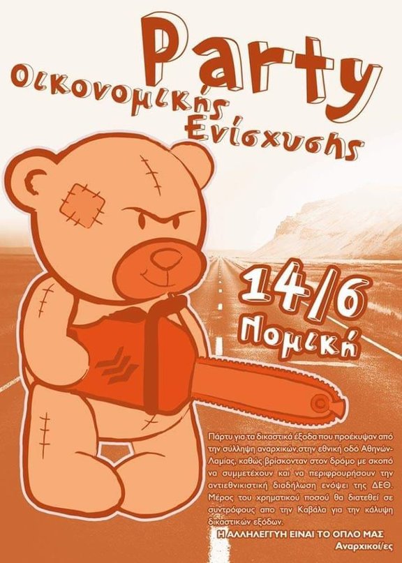 Party για τα δικαστικά έξοδα που προέκυψαν από τη σύλληψη συντρόφων στην εθνική οδό Αθηνών-Λαμίας, καθώς βρίσκονταν στον δρόμο για να συμμετάσχουν και να περιφρουρήσουν την αντιεθνικιστική διαδήλωση ενόψει της ΔΕΘ. Μέρος του χρηματικού ποσού θα διατεθεί σε συντρόφους από την Καβάλα για κάλυψη δικαστικών εξόδων.