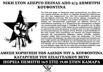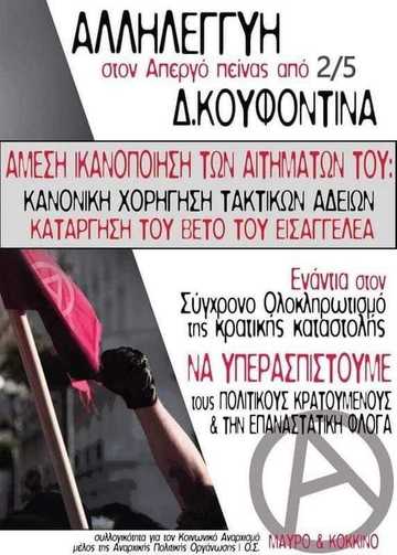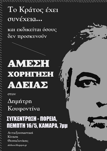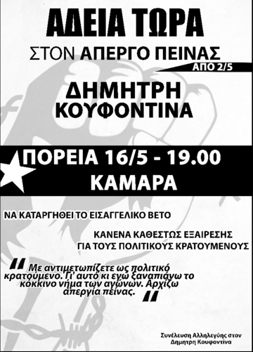 ΑΜΕΣΗ ΧΟΡΗΓΗΣΗ ΑΔΕΙΩΝ ΣΤΟΝ ΕΠΑΝΑΣΤΑΤΗ ΔΗΜΗΤΡΗ ΚΟΥΦΟΝΤΙΝΑ (απεργία πείνας από 2/5)