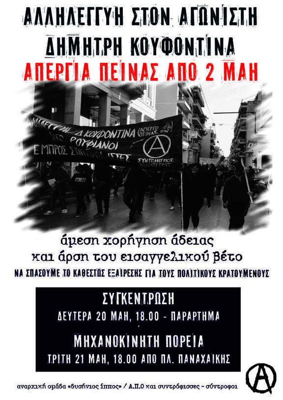 Καλέσματα αλληλεγγύης στο Δ. Κουφοντίνα (απεργία πείνας από 2 Μάη)