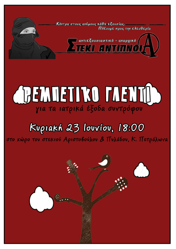 Ακύρωση του προγραμματισμένου για την Κυριακή 23/6, ρεμπέτικου γλεντιού, για τα ιατρικά έξοδα συντρόφου, στο αναρχικό-αντιεξουσιαστικό στέκι Αντίπνοια