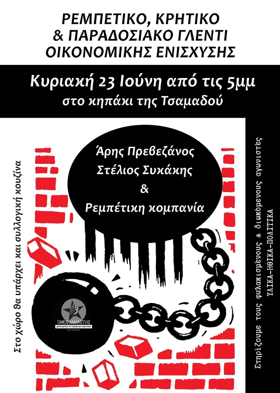 Ρεμπέτικο/ Κρητικό γλέντι οικονομικής ενίσχυσης. Κυριακή 23/6 μετά τις 3μμ στο κηπάκι της Τσαμαδού. Στηρίζουμε τους φυλακισμένους αγωνιστές υλικά, ηθικά, πολιτικά. Ταμείο Αλληλεγγύης Φυλακισμένων και Διωκόμενων Αγωνιστών. (Σύντομα αφισάκι)