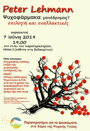 Στα πλαίσια του εκπαιδευτικού προγράμματος του Παρατηρητηρίου και της θεματικής ενότητας "συνομιλία με την ψύχωση, συνοδεία προς την ανάρρωση" , θα πραγματοποιηθεί εκδήλωση-συζήτηση από τον Peter Lehmann με θέμα "Ψυχοφάρμακα: Μονόδρομος; Επιλογή και Εναλλακτικές",