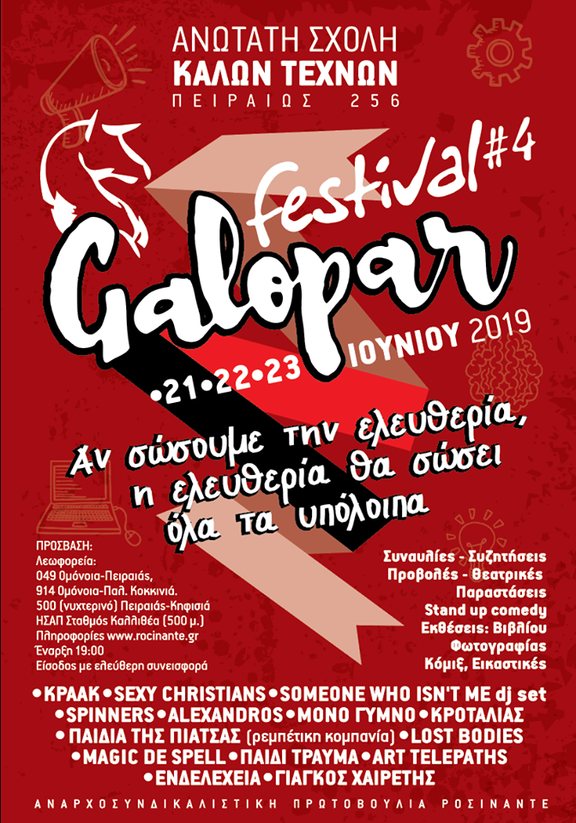 Tο Galopar επιστρέφει! Για μια ακόμα χρονιά, το φεστιβάλ της Αναρχοσυνδικαλιστικής Πρωτοβουλίας Ροσινάντε φιλοδοξεί να αποτελέσει μια εστία ελευθεριακού πολιτισμού στο κέντρο της Αθήνας και φέτος πραγματοποιεί τον τέταρτο καλπασμό του στην Ανώτατη Σχολή Καλών Τεχνών, το τριήμερο 21, 22 και 23 Ιουνίου.