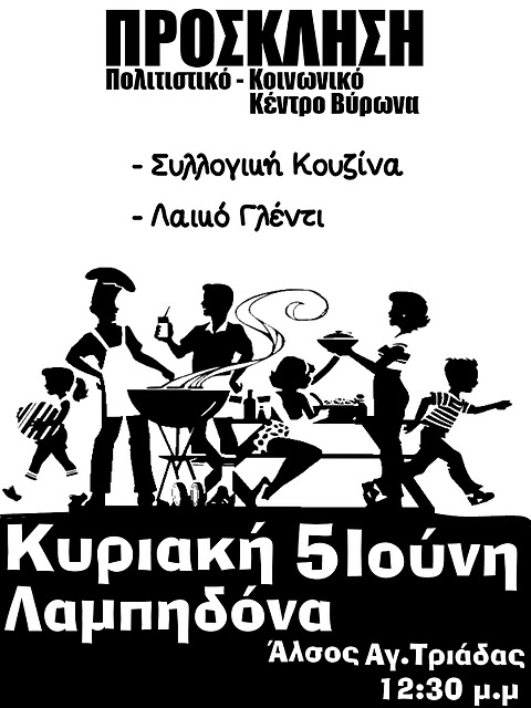 Σας καλουμε ολους την Κυριακη 5 Ιουνιου 12:30 στην Λαμπηδονα που θα πραγματοποιηθει η Συλογγικη κουζινα του Κοινωνικου - Πολιτιστικου Κεντρου Βυρωνα.Μαγειρευουμε και τρωμε ολοι μαζι στον χωρο που σε λιγο καιρο θα μας φιλοξενει.