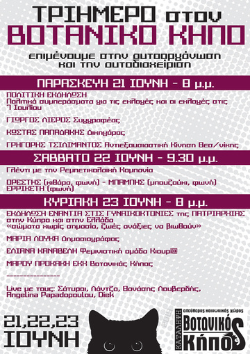 21 - 22 - 23 Ιουνίου. Με αφορμή τις τελευταίες πολιτικές εξελίξεις και τις επερχόμενες Εθνικές Εκλογές ο Βοτανικός Κήπος Πετρούπολης δηλώνει ότι είναι εδώ και επιμένει στην αυτοοργάνωση και την αυτοδιαχείριση.