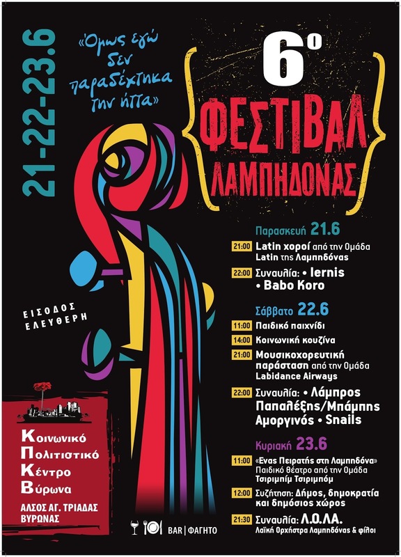 Όπως κάθε χρόνο, για τα τελευταία 6 χρόνια, έτσι και φέτος, το Κοινωνικό - Πολιτιστικό Κέντρο Βύρωνα διοργανώνει ένα τριήμερο φεστιβάλ στις 21, 22 και 23 Ιουνίου. Μια γιορτή όπου για τρείς ημέρες έχουμε την ευκαιρία να βρεθούμε ξανά στο πάρκο της Λαμπηδόνας, να ψυχαγωγηθούμε, να μιλήσουμε, να υπάρξουμε μαζί. Στη γιορτή αυτή είστε όλοι προσκεκλημένοι. Σας περιμένουμε για να ζήσουμε μαζί τρείς ημέρες γεμάτες, μουσική, χορό, θέατρο, συζητήσεις και δραστηριότητες για μικρούς και μεγάλους.