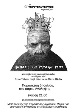 Η παράσταση «Πονάει το μυαλό μου» αποτελεί στην ουσία, τη συνέχεια της παράστασης Τσιριτσάντσουλες-Βαριετέ που είχε ανέβει το 2005. Τότε, με πρότυπο τα κείμενα του Καρλ Βάλεντιν από τις παραστάσεις καμπαρέ που έδινε στο μεσοπόλεμο, είχαμε φτιάξει τα δικά μας κείμενα που τα παρουσιάσαμε σαν ένα σόου Βαριετέ. Τώρα παίρνουμε τα γνήσια κείμενα του μεγάλου γερμανού θεατρίνου και μαζί με κείμενα άλλων δύο θρύλων της παγκόσμιας δραματουργίας, του ρώσου Άντον Τσέχοφ και των Βρετανών Μόντυ Πάιθον, συνθέσαμε τη φετινή μας παράσταση. Η μίξη αυτών των τριών διαφορετικών γραφών φαντάζει ίσως περίεργη. Οι δημιουργοί τους προέρχονται από τρεις τελείως διαφορετικές κουλτούρες και είναι εκπρόσωποι τριών διαφορετικών γενιών κωμικών με σχεδόν μισό αιώνα διαφορά ο ένας από τον άλλον. Κι όμως, διαβάζοντας τα μικρά διηγήματα του Τσέχοφ δεν μπορεί να μην έρθουν στο μυαλό σου εικόνες από τις ταινίες των Πάιθον και όταν βλέπεις τον «Παπαγάλο» των τελευταίων δεν μπορείς να μην ανατρέξεις στο κλασικό «το πουλί και το κλουβί» του Βάλεντιν. Έτσι λοιπόν, έστω κι αν διαφέρουν χρονικά και πολιτισμικά οι δημιουργοί, τα έργα τους συναντιώνται σε ένα ουδέτερο έδαφος. Ένα έδαφος διεθνές και διαχρονικό, αυτό της κωμωδίας. Όχι όμως μιας οποιασδήποτε κωμωδίας, αλλά μιας κωμωδίας που καταρρίπτει τις φόρμες, ανατρεπτική, σχεδόν παράλογη, που είναι δυνατόν τόσο να σε απελευθερώσει και να φέρει την κάθαρση, όσο και να σου κάψει ολοκληρωτικά τον εγκέφαλο.