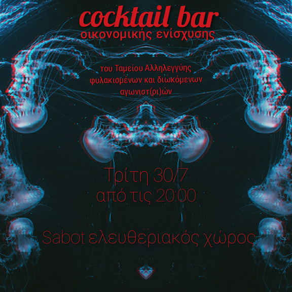 Την Τρίτη 30/7, από τις 20:00 θα πραγματοποιηθεί Cocktail Bar στον ελευθεριακό χώρο Sabot, για την ενίσχυση του Ταμείου Αλληλεγγύης φυλακισμένων & διωκόμενων αγωνιστ(ρι)ών, με live dj-set.