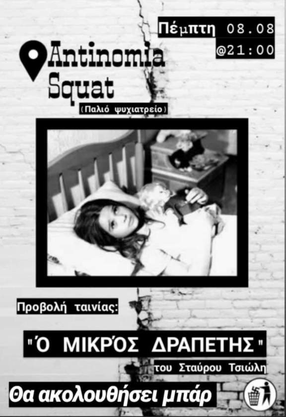 Η κατάληψη Αντινομια διοργανωνει την προβολη της ταινιας "ο μικρός δραπέτης" στον χώρο της κατάληψης στις 8/8.Θα ακολουθήσει και μπαρ οικονομικής ενίσχυσης της κατάληψης.