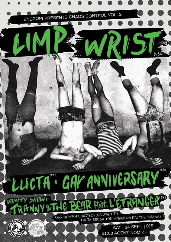 In light of their 20th anniversary as one of the trailblazers of the global queercore punk scene, Limp Wrist visit Athens for the first time, two years after their latest, kicking record "Facades" (LVEUM). With them: raging hardcore darlings Lucta from Milan, Italy, Athens-via-Volos fuckwave lords Gay Anniversary with their new album "Music for Families" (Είσοδος Κινδύνου Records) and a fabulous Vanity Show by Tranny & the Bear featuring L'Étranger (Athens).