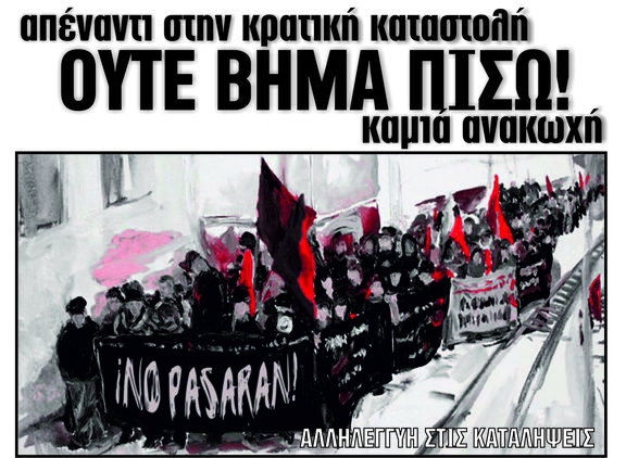 Με όπλο μας την αλληλεγγύη να δώσουμε το σύνθημα της αντεπίθεσης στην κρατική και καπιταλιστική βαρβαρότητα. Να αναζωπυρώσουμε τις εστίες της κοινωνικής και ταξικής αντίστασης. Καλούμε τους αναρχικούς συντρόφους και συντρόφισσες, τους καταληψίες, όσους αγωνίζονται σε όλο τον κόσμο να οργανώσουν δράσεις και κινήσεις αλληλεγγύης στο αναρχικό κίνημα και τις καταλήψεις στην Ελλάδα. Η διεθνιστική αλληλεγγύη μπορεί να αποτελέσει ένα ακόμα ανάχωμα στα σχέδια του κράτους και του κεφαλαίου και να ενισχύσει τις αντιστάσεις όλων των αγωνιζόμενων σε κάθε γωνιά του πλανήτη.