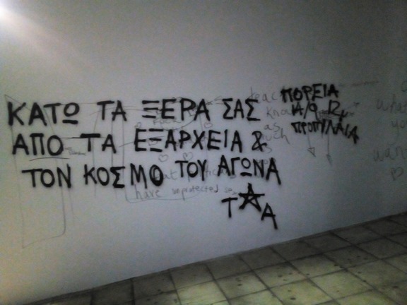 Που εκδηλώνεται με τα σχέδια αστυνομικής κατοχής των Εξαρχείων και τις επιθέσεις σε χώρους αγώνα, με την κατάργηση του ασύλου, τις διώξεις και φυλακίσεις αγωνιστών, την αναβάθμιση του νομικού οπλοστασίου του κράτους
