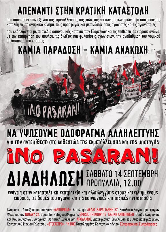 Καλούμε τους αναρχικούς συντρόφους/ισσες, τους καταληψίες, όσους αγωνίζονται ενάντια στην παγκόσμια δικτατορία του κράτους και του κεφαλαίου σε κάθε γωνιά του κόσμου να στηρίξουν την καμπάνια NO PASARΑN, τον αγώνα για την υπεράσπιση των καταλήψεων, των προσφύγων και των μεταναστών, και για την αντεπίθεση στην κρατική καταστολή.