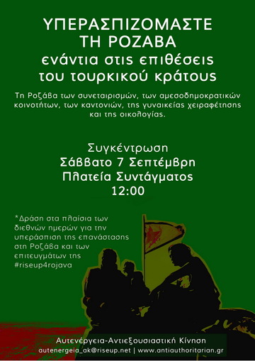 Ανταποκρινόμενοι-ες στο διεθνές κάλεσμα αλληλεγγύης #RiseUp4Rojava στις δημοκρατικές κοινότητες της Ροζάβα, καλούμε σε συγκέντρωση στην πλατεία Συντάγματος στις 7 Σεπτέμβρη στις 12:00 το μεσημέρι.