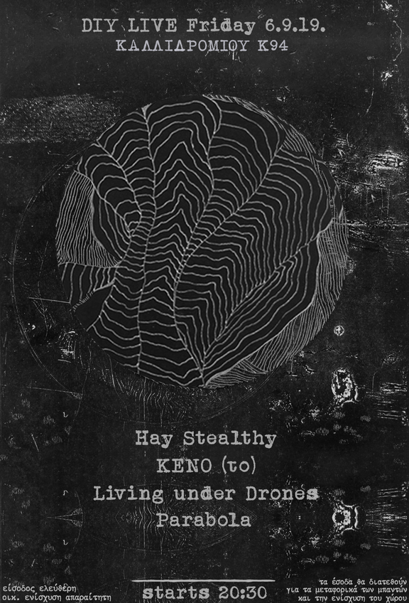 Ξεκίνημα για την ομάδα Πείραμα με θόρυβο/ μελωδίες/ κραυγές/ φωνές/ κοπάνημα/ χορό από Parabola, Living under Drones, ΚΕΝΟ (το), Hay Stealthy. Παρασκευή 6 Σεπτέμβρη στις 20.30, στην Υπόγα, Καλλιδρομίου 94.