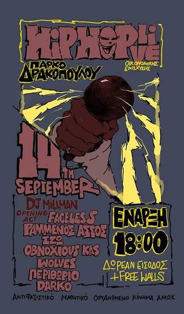 Στις 14 Σεπτεμβρίου ο αντιφασιστικός μας αγώνας αποκτά μουσικό χαρακτήρα. Με σκοπό την οικονομική ενίσχυση της ομάδας μας, διοργανώθηκε μια χιπ χοπ βραδιά για την αύξηση της ποιότητας και αποδοτικότητας των δράσεων μας για την καλύτερη επίτευξη του απώτερου μας σκοπού, την όσο δυνατή καταπολέμηση του φασισμού.