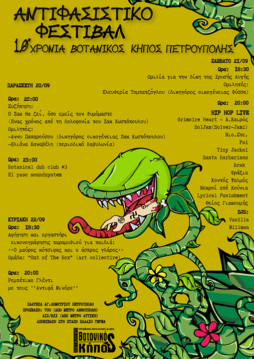 Ο Βοτανικός Κήπος κλείνει 10 χρόνια δράσης και το γιορτάζει με ένα τριήμερο αντιφασιστικό φεστιβάλ την προτελευταία βδομάδα το Σεπτέμβρη.