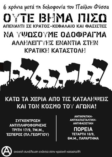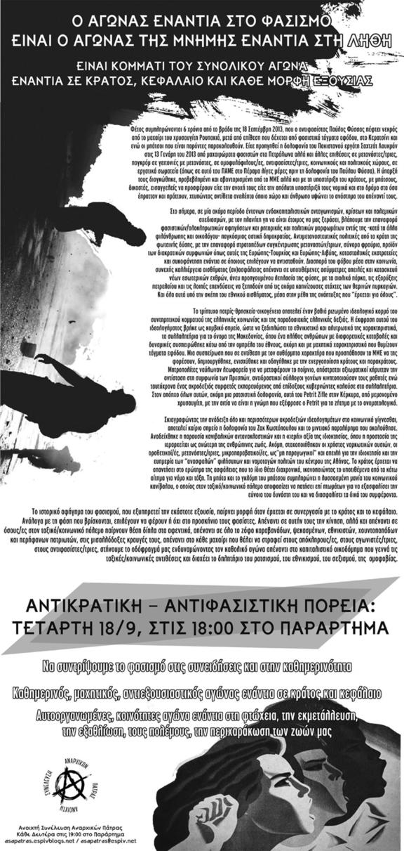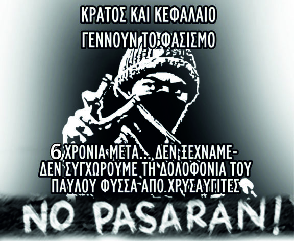 Έξι χρόνια συμπληρώνονται από την παρακρατική δολοφονία του Παύλου Φύσσα, του αντιφασίστα Killah-P από το μαχαίρι του φασίστα χρυσαυγήτη Ρουπακιά, στις 18 Σεπτέμβρη του 2013 .Το επόμενο απόγευμα της δολοφονίας, πάνω από 20000 άτομα πλημμυρίζουν τους δρόμους του Κερατσινίου, εκφράζοντας την οργή τους, κάτι που βέβαια αντιμετωπίζεται άμεσα με σφοδρή επίθεση από τις δυνάμεις των ΜΑΤ, πίσω από τις οποίες παράλληλα ενεργούν ανενόχλητα ομάδες φασιστών. Εικόνα πολύ γνωστή που απεικονίζει τις σχέσεις κράτους-παρακράτους. Ο φασισμός εξάλλου είναι γέννημα και ουσιαστικός μηχανισμός του συστήματος που το γεννάει, του κράτους και του κεφαλαίου. Ακόμα και η μεταγενέστερη δίωξη των φασιστών δεν μπορεί να ερμηνευτεί ως μια πράξη "αντιφασισμού", ούτε καν ως μια πράξη "δικαιοσύνης". Αλλά μια πράξη ξεπλύματος των φασιστών (απόδειξη αυτού, απόφαση του δικαστηρίου στους 2 χρυσαυγήτες για την επίθεση στο συνεργείο, αλλά και η πτώση στα μαλακά των δολοφόνων φασιστών χρυσαυγητών του Σαχζάτ Λουκμάν).