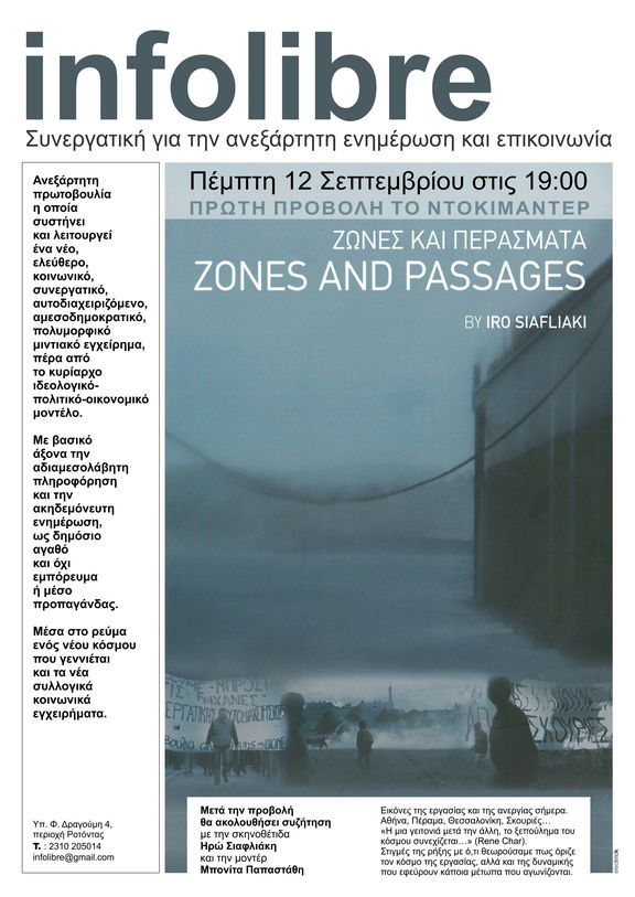 Πρώτη προβολή του νέου μιντιακού εγχειρήματος infolibre το ντοκιμαντέρ Ζώνες και Περάσματα, την Πέμπτη 12/9 στις 19:00 στο χώρο του Υπ. Φ. Δραγούμη (περιοχή Ροτόντας).