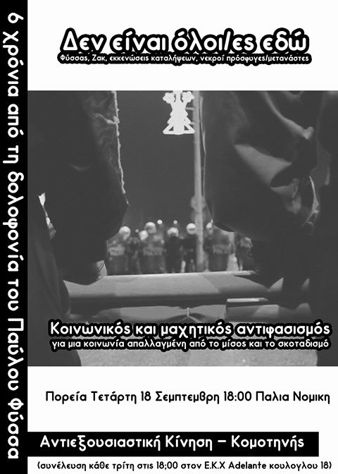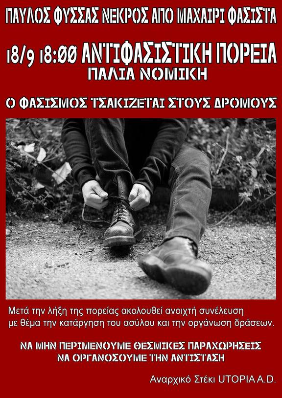 18/9 ώρα 18:00 παλιά νομική Αντιφασιστική Πορεία. Θα ακολουθήσει συνέλευση με θέμα την κατάργηση του ασύλου και την οργάνωση δράσεων.