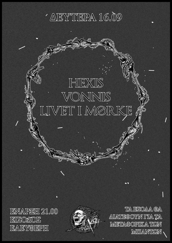 Στο 2ο μετα-καλοκαιρινό λάηβ, σκοτεινιάζουμε κι άλλο το κλίμα και υποδεχόμαστε τους Χέξις από δανία μεριά, τους Βόννις από βέλγιο και τους αγαπητούς Livet i Mørke.