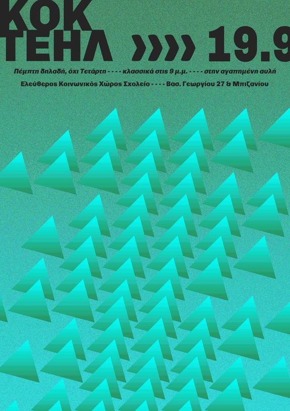 Το "κλασσικά κάθε Τετάρτη cocktail στην αυλή του Σχολείου" αυτή τη βδομάδα μεταφέρεται - εκτάκτως - για την Πέμπτη 19.9 λόγω της συμμετοχής στην πορεία μνήμης για τη συμπλήρωση 6 χρόνων από τη δολοφονία του Π. Φύσσα.