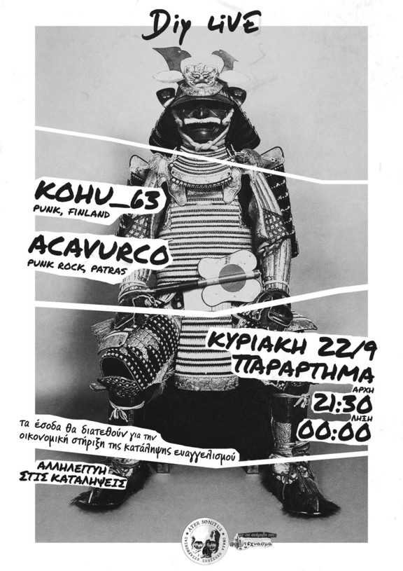 …στις 21.30 από την ομάδα ηχητικής δυσαρμονίας ATER SONITUS με τη στήριξη της ομάδας αυτοοργανωμένης έκφρασης ΤΕΧΝΑΣΜΑ. Τα έσοδα θα διατεθούν για την οικονομική στήριξη της κατάληψης ευαγγελισμού στο ηράκλειο.