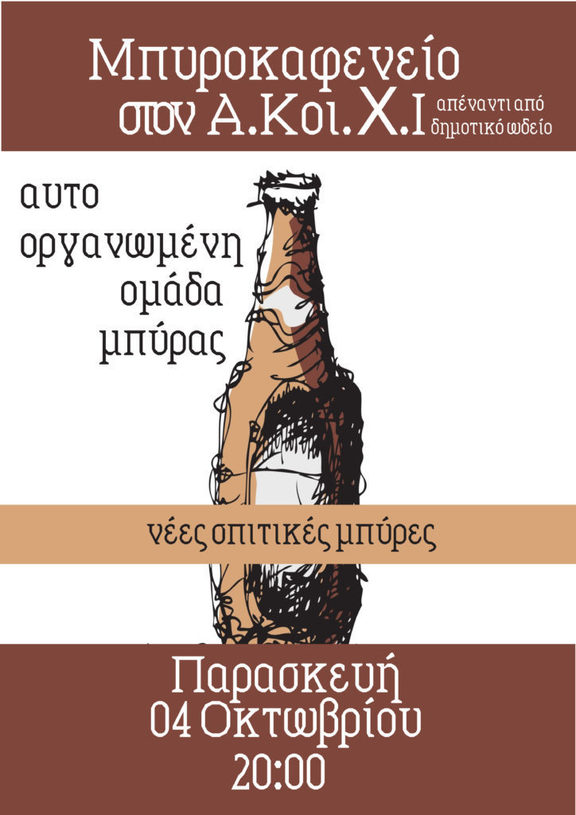 Η αυτοοργανωμένη ομάδα μπύρας σας προσκαλεί στο καφενείο που διοργανώνει την Παρασκευή 4 Οκτωβρίου (Octobeer 4th) στις 20.00 στον Αυτοδιαχειριζόμενο Κοινωνικό Χώρο Ιωαννίνων*.