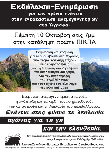Εκδήλωση-Ενημέρωση για τον αγώνα ενάντια στην εγκατάσταση ανεμογεννητριών στα Άγραφα-Πέμπτη 10 Οκτώβρη στις 7μμ στην κατάληψη πρώην ΠΙΚΠΑ