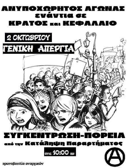 Απέναντι στην επίθεση του χρεοκοπημένου κόσμου κράτους και καπιταλισμού που επιβάλλει την φτώχεια, την εξαθλίωση, την εξατομίκευση και τους πλαστούς διαχωρισμούς ανάμεσα στους ανθρώπους της τάξης μας, επιλέγουμε να αγωνιστούμε από τα κάτω όλοι μαζί, ντόπιοι, μετανάστες, φοιτητές, μαθητές, εργαζόμενοι και άνεργοι. Η μόνη πραγματική προοπτική για να ζήσουμε με αξιοπρέπεια είναι η οργανωμένη κοινωνική και ταξική αντεπίθεση των καταπιεσμένων και εκμεταλλευόμενων για την ανατροπή του κόσμου της εξουσίας, μέσα από συλλογικούς αγώνες, με πυξίδα την οικοδόμηση μια κοινωνίας ισότητας, αλληλεγγύης και ελευθερίας.Με ταξικά σωματεία και πρωτοβουλίες εργαζομένων της βάσης να διεκδικήσουμε ότι μας ανήκει, μακριά από τις συνδικαλιστικές ελίτ οι οποίες έχουν συμπληρωματικό ρόλο ως προς την εργοδοσία. Ενάντια στην καπιταλιστική βαρβαρότητα και την κρατική καταστολή προτάσσουμε την ταξική αλληλεγγύη, υπερασπιζόμαστε την απεργία, παίρνουμε την ζωή στα χέρια μας.