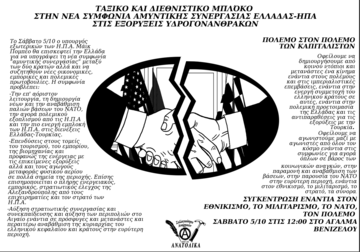 Ένα κίνημα ΤΑΞΙΚΟ και ΔΙΕΘΝΙΣΤΙΚΟ, που θα ανοίξει και θα βαθύνει μέσα στην κοινωνία τη συζήτηση και την πάλη ενάντια στη βαρβαρότητα των πολέμων αλλά και ενάντια στην "ειρήνη" που τους γεννά και θα δείξει πως είναι πολλοί και πολλές αυτοί που ξέρουν πως ο "εχθρός είναι μέσα στην ίδια τους τη χώρα", που δεν είναι διατεθειμένοι να συνεχίσουν να είναι το λάδι που καίει η παγκόσμια καπιταλιστική και πολεμική μηχανή.