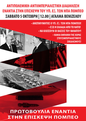 Η επίσκεψη του Αμερικάνου υπουργού εξωτερικών Πομπέο στη χώρα μας αποτελεί ένα σημαντικό πολιτικό γεγονός και όχι μια απλή επίσκεψη «διπλωματικού» χαρακτήρα. Ο Πομπέο έρχεται να επιβλέψει, να επιτηρήσει και να υλοποιήσει μια σειρά επιδιώξεις του Αμερικάνικου ιμπεριαλισμού. Όλα αυτά σε πλήρη σύμπνοια με την κυβέρνηση της ΝΔ, που συνεχίζει ατόφια την πολιτική της κυβέρνησης ΣΥΡΙΖΑ: υποταγή στον αμερικάνικο ιμπεριαλισμό - εμπλοκή της χώρας μας στα πολεμικά σχέδια.