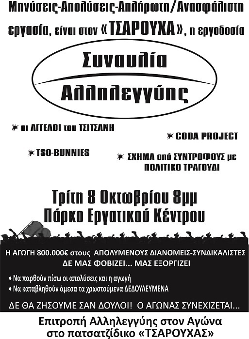 ΣΥΝΑΥΛΙΑ ΑΛΛΗΛΕΓΓΥΗΣ: Τρίτη 8 Οκτώβρη στις 8 μμ, στο πάρκο του Εργατικού Κέντρου (Αριστοτέλους με Ολύμπου)