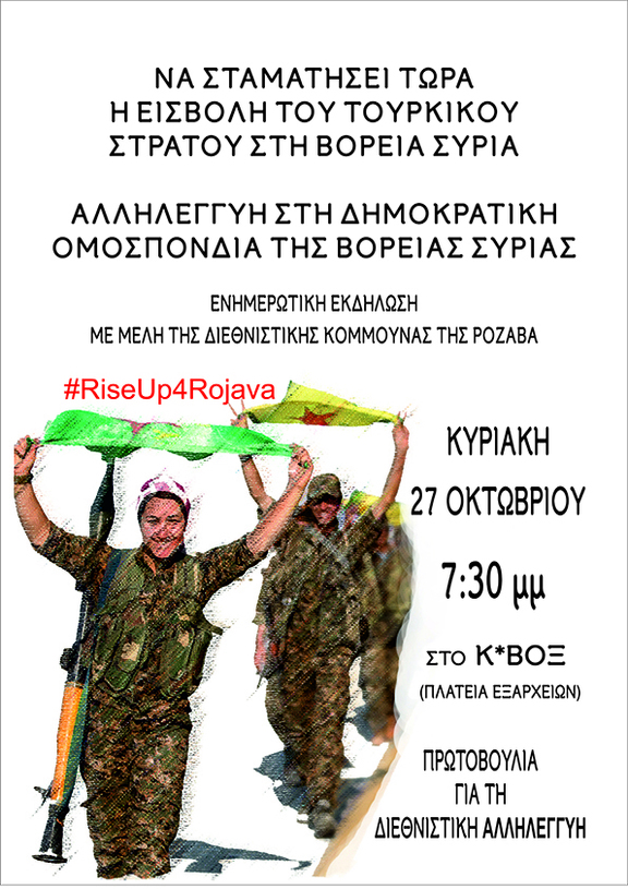 Ενημερωτική εκδήλωση με μέλη της Διεθνιστικής Κομμούνας της Ροζάβα για τις εξελίξεις στη ΒΑ Συρία, την Τουρκική εισβολή και τον Αγώνα για την υπεράσπιση της Επανάστασης στη Ροζάβα