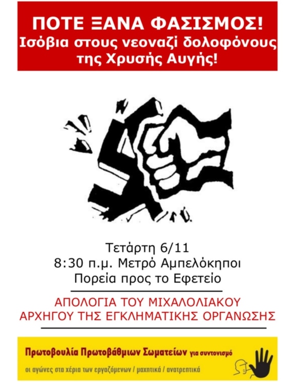 Όλοι στο Eφετείο (Aλεξάνδρας) την Tετάρτη 6 Nοέμβρη, 8:30 π.μ. Oύτε σπιθαμή στους φασίστες!