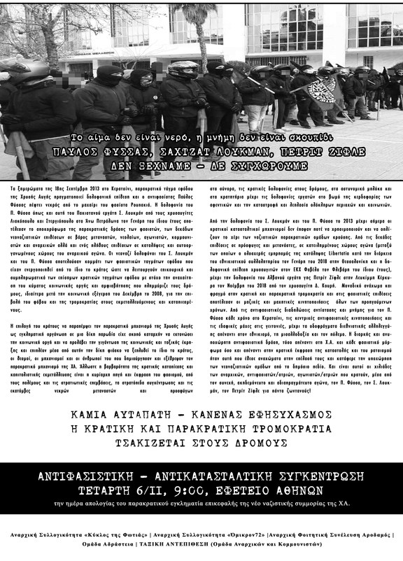 Από την δολοφονία του Σ. Λουκμάν και του Π. Φύσσα το 2013 μέχρι σήμερα οι κρατικοί κατασταλτικοί μηχανισμοί δεν έπαψαν ποτέ να χρησιμοποιούν και να οπλίζουν το χέρι των ναζιστικών παρακρατικών ομάδων κρούσης. Από τις δεκάδες επιθέσεις σε πρόσφυγες και μετανάστες, σε κατειλημμένους χώρους αγώνα (μεταξύ των οποίων ο ολοσχερής εμπρησμός της κατάληψης Libertatia κατά την διάρκεια του εθνικιστικού συλλαλητηρίου τον Γενάρη του 2018 στην Θεσσαλονίκη και η δολοφονική επίθεση χρυσαυγιτών στον ΕΚΧ Φαβέλα τον Φλεβάρη του ίδιου έτους), μέχρι την δολοφονία του Αλβανού εργάτη γης Πετρίτ Ζίφλε στην Λευκίμμη Κέρκυρα τον Νοέμβρη του 2018 από τον χρυσαυγίτη Δ. Κουρή. Μοναδικό ανάχωμα και φραγμό στην κρατική και παρακρατική τρομοκρατία και στις φασιστικές επιθέσεις αποτέλεσαν οι μαζικές και μαχητικές κινητοποιήσεις όλων των προηγούμενων χρόνων. Από τις αντιφασιστικές διαδηλώσεις αντίστασης και μνήμης για τον Π. Φύσσα κάθε χρόνο στο Κερατσίνι, τις κεντρικές αντιφασιστικές κινητοποιήσεις και τις εδαφικές μάχες στις γειτονιές, μέχρι τα οδοφράγματα διεθνιστικής αλληλεγγύης απέναντι στον εθνικισμό, τη μισαλλοδοξία και τον πόλεμο. Η διαρκής και ανυποχώρητη αντιφασιστική δράση, τόσο απέναντι στη Χ.Α. και κάθε φασιστικό μόρφωμα όσο και απέναντι στην κρατική έκφραση της καταστολής και του ρατσισμού ήταν αυτή που έθεσε αναχώματα στην επέλασή τους και κατάφερε την υποχώρηση των νεοναζιστικών ομάδων από το δημόσιο πεδίο. Και είναι αυτοί οι χιλιάδες των αναρχικών, αντιφασιστών/στριών, αγωνιστών/στριών που κρατούν, μέσα από τον συνεχή, ακηδεμόνευτο και αδιαπραγμάτευτο αγώνα, τον Π. Φύσσα, τον Σ. Λουκμάν, τον Π. Ζίφλε για πάντα ζωντανούς!
