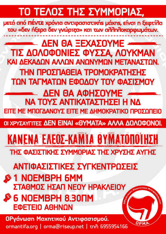 Αντιφασιστικές συγκεντρώσεις 1η & 6η Νοέμβρη: Κανένα έλεος - καμία θυματοποίηση της φασιστικής συμμορίας της Χρυσής Αυγής
