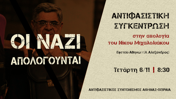Στις 6 Νοεμβρίου απολογείται στο δικαστήριο ο φύρερ της Χρυσής Αυγής, Νίκος Μιχαλολιάκος. Είναι κρίσιμη στιγμή, καθώς ο αρχηγός της ναζιστικής συμμορίας έρχεται στο εδώλιο του κατηγορουμένου και καλείται να δώσει εξηγήσεις για τη δολοφονική δράση της Χρυσής Αυγής όλα αυτά τα χρόνια. Δεν ξεχνάμε ότι το αντιφασιστικό κίνημα έκατσε τους χρυσαυγίτες στο σκαμνί, τους απομόνωσε από τις γειτονιές μας και τελικά τους έδιωξε από το κοινοβούλιο. Αλλά δεν χωράει εφησυχασμός. Συνεχίζουμε για να τους χώσουμε ισόβια στη φυλακή. Δεν θα επιτρέψουμε ο Μιχαλολιάκος και η παρέα του να πέσουν στα μαλακά.