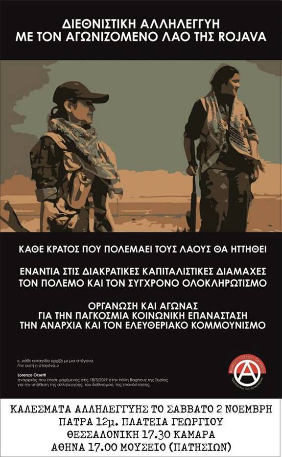 Αναγνωρίζοντας στον αγώνα των ανταρτών και ανταρτισσών στη Συρία, τη δίψα για κοινωνική αλλαγή, τη δίψα για ζωή και το όνειρο της επανάστασης στεκόμαστε αλληλέγγυοι και αλληλέγγυες με κριτική σκέψη αλλά πάνω απ' όλα σεβασμό στη μαχητική διεκδίκηση της αυτονομίας τους, σκεπτόμενοι τη θέση από την οποία μιλάμε και πράττουμε. Ενώνουμε τις φωνές μας απο τα μητροπολιτικά πεδία της Ευρώπης μέχρι τα επαναστατημένα βουνά της Μέσης Ανατολής, φωνάζοντας όλοι μαζί πως τα όπλα των ανταρτισσών και ανταρτών έχουν τις δικές μας σφαίρες. Μεταφέρουμε τον αγώνα τους και τον συνδέουμε με τους δικούς μας αγώνες εντείνοντας τον μοναδικό πόλεμο στον οποίο στρατευόμαστε με όλη μας τη ψυχή. Γιατί η ειρήνη των καταπιεσμένων, θα έρθει μόνο μέσα από τον πόλεμο των τάξεων. Τον πόλεμο για την Επανάσταση και την Αναρχία.