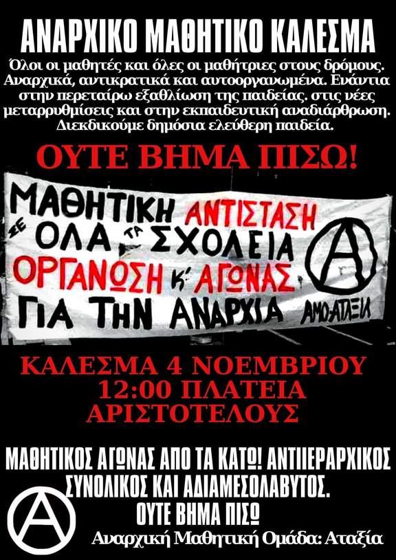 Εμείς ως αναρχικοί/ές μαθητές/τριες δεν θα αφήσουμε το Υπουργείο Παιδείας να παίζει με τις ζωές μας. Δεν θα αφήσουμε τα μέτρα τους να μας υποτάξουν και να εξαθλιώσουν ακόμα περισσότερο την παιδεία. Αγωνιζόμαστε για ένα σχολείο ελεύθερο, που θα μορφώνει και δεν θα παραμορφώνει. Αναρχικός μαθητικός αγώνας από τα κάτω, για την διεκδίηση των όσων μας αξίζουν, για μια ζωή με αξιοπρέπεια.