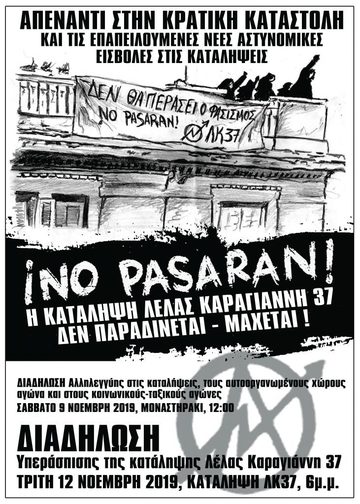 iNO PASARAN! ΔΙΑΔΗΛΩΣΗ Υπεράσπισης της Κατάληψης Λέλας Καραγιάννη 37: Τρίτη 12/11, Κατάληψη ΛΚ 37, 6μ.μ.