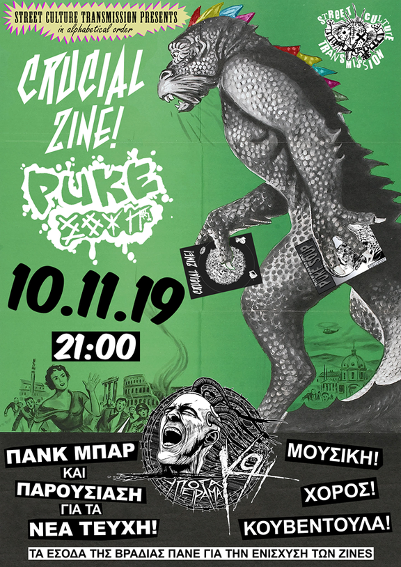 Crucial zine! + puke σουπ = Κυριακάτικο πανκ μπαρ στις 10 Νοέμβρη από τις 21.00 στο χώρο της Υπόγας, Καλλιδρομίου 94. Θα έχει παρουσίαση για τα νέα τεύχη! Και μουσική! Και χορός! Και κουβεντούλα! Τα έσοδα της βραδιάς πάνε για την ενίσχυση των zines.